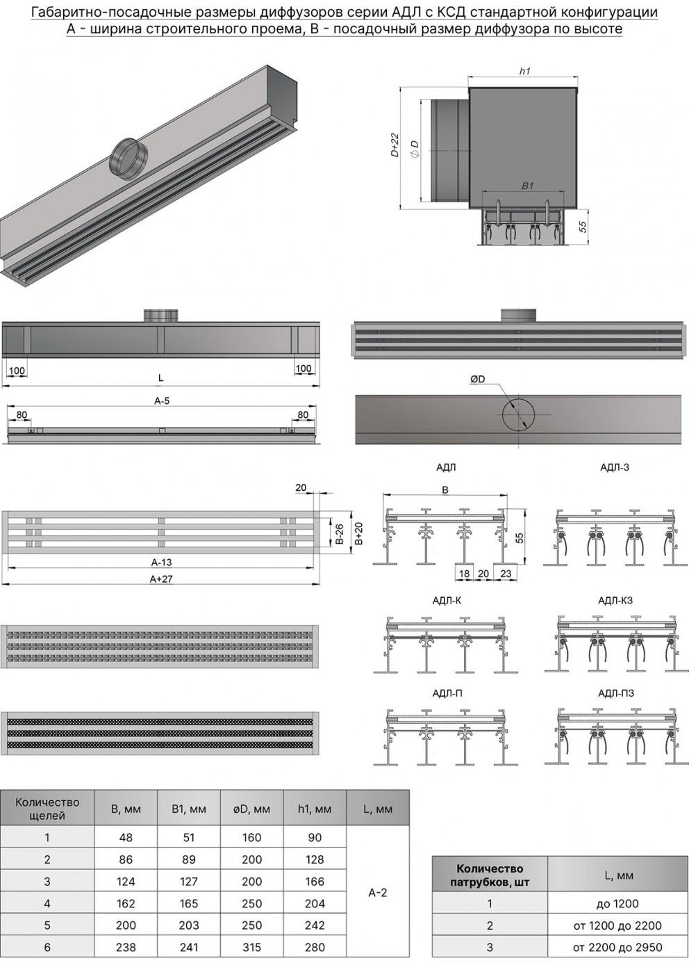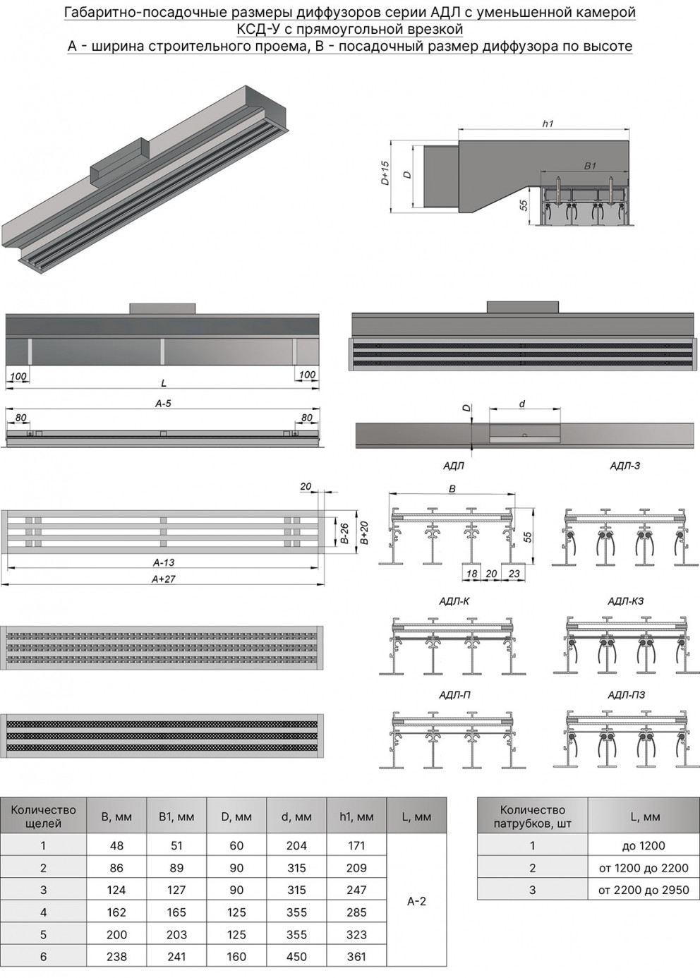 Щелевой диффузор АДЛ-П применяется в системе приточно-вытяжной вентиляции. Конструктивно состоит из видимой рамки и выравнивателя потока воздуха. По дополнительному запросу возможна комплектация направляющими потока воздуха. Могут быть самостоятельным изделием в виде одиночной секции или ее составной частью. Возможное количество щелей от 1 до 10.