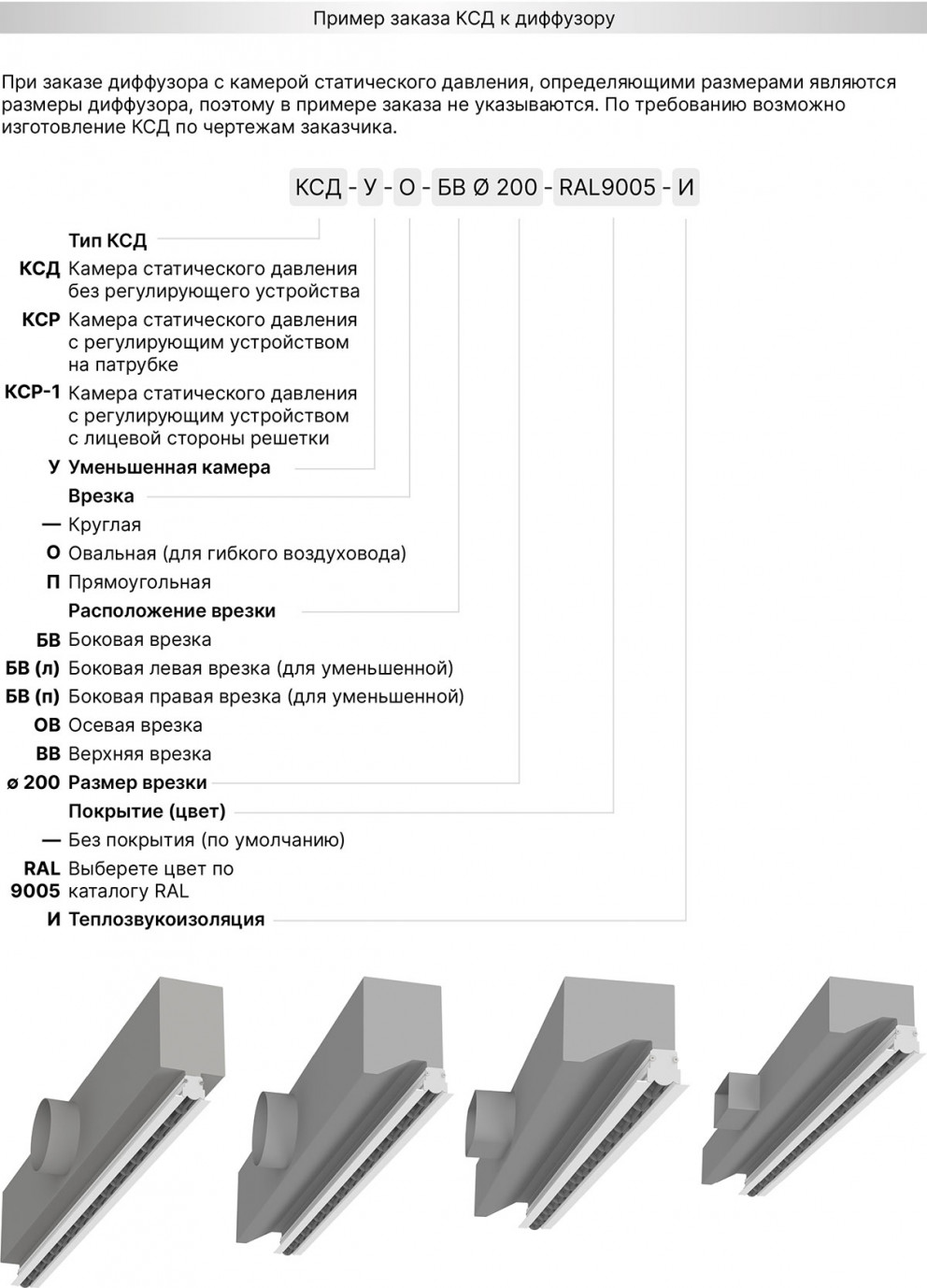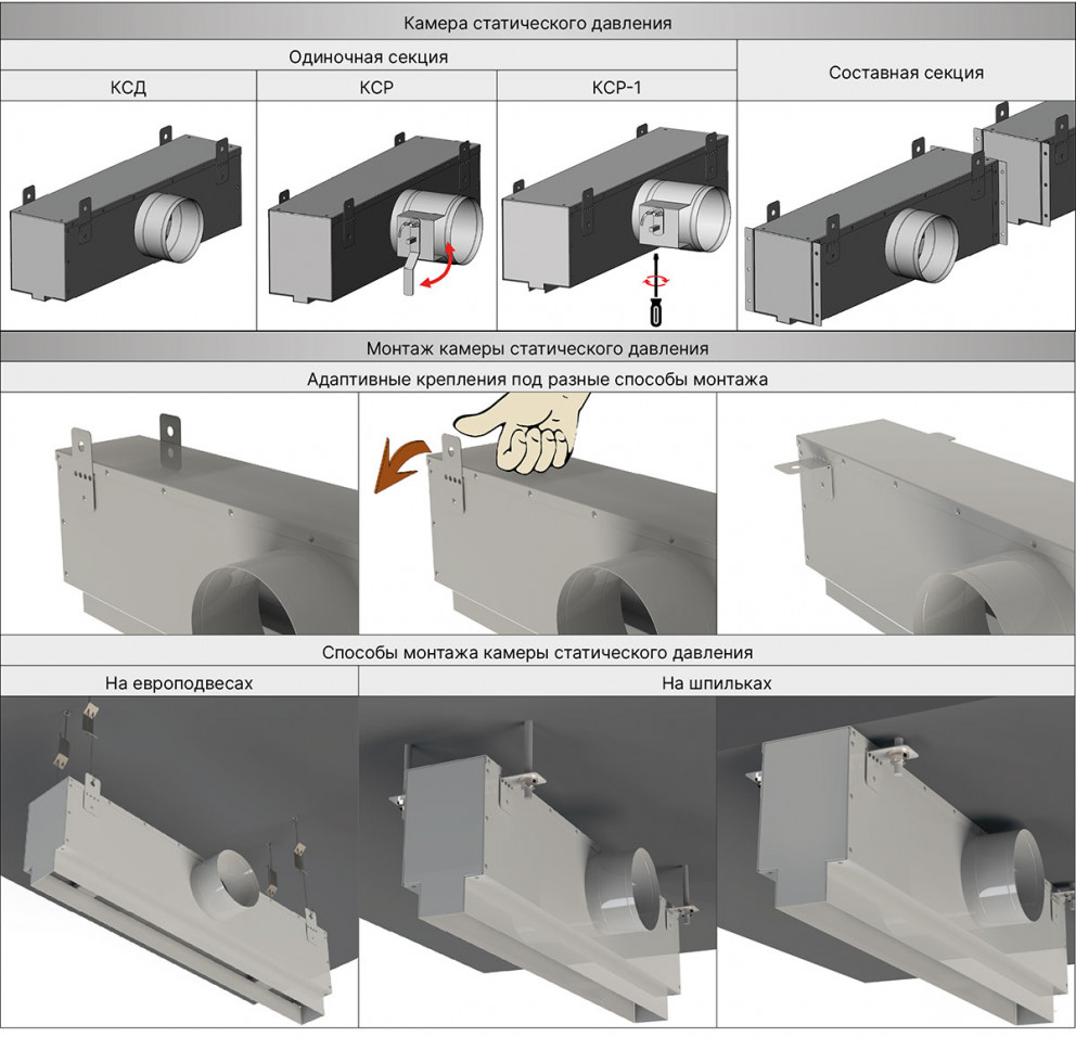 Для подключения к системе вентиляции и кондиционирования используется камера статического давления (адаптер) - КСД или КСР.