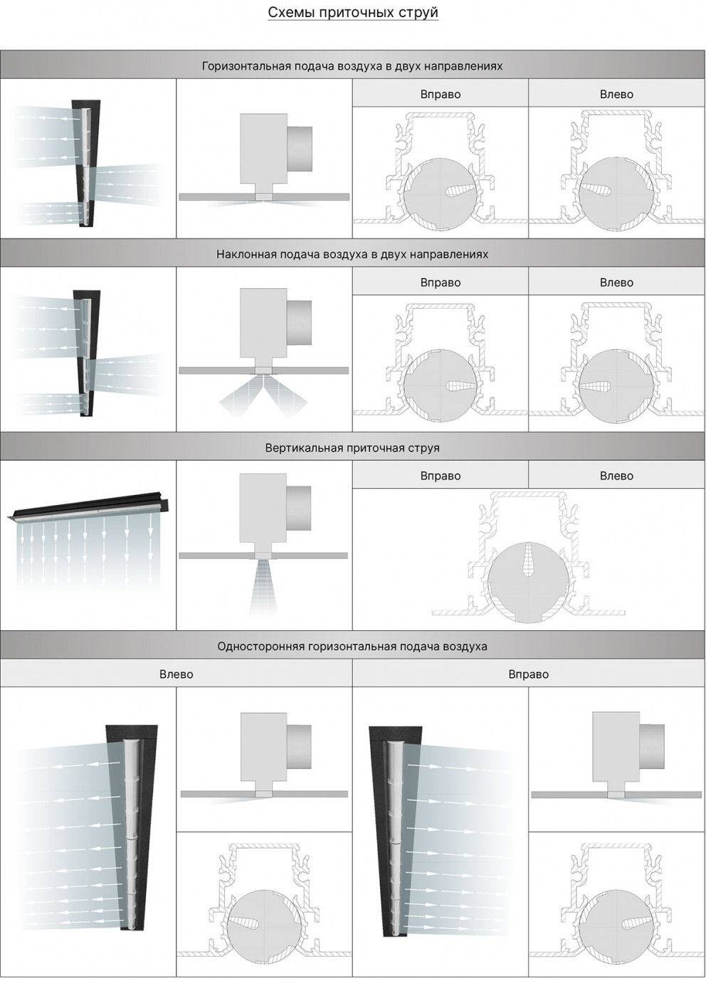 - Возможность регулирования направления воздушного потока горизонтально, вертикально и наклонно. Направление приточной струи настраивается вручную в одном или одновременно в нескольких направлениях, что позволяет адаптировать приток воздуха к конкретным условиям.