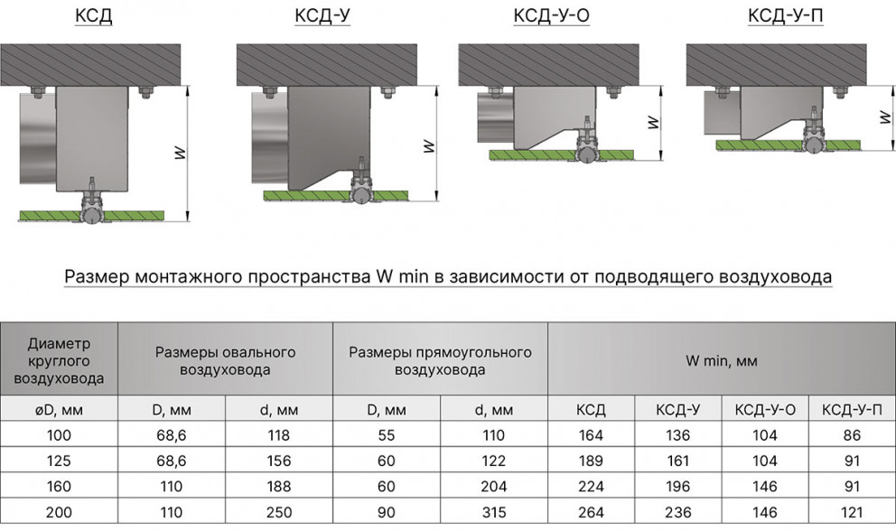 Размер монтажного пространства (W) напрямую зависит от размера подключаемого воздуховода - чем меньше воздуховод, тем меньше адаптер для диффузора. В каталоге приведены рекомендуемые размеры воздуховода, но по запросу заказчика возможно изготовить адаптер с любой врезкой.