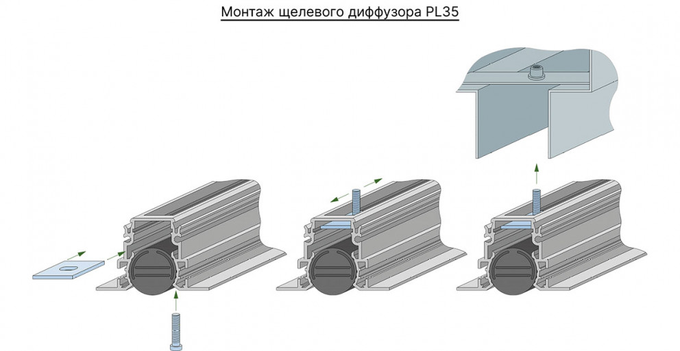 Рекомендованная высота для установки диффузора PL35 не более 4 м. Монтаж производится с помощью винтового соединения к закладным деталям в КСД через специальные изделия для крепления. В случае монтажа непрерывной конструкции, необходимо устанавливать в места соединения выравнивающие пластины. Изделия для крепления диффузоров входят в комплект поставки. После монтажа видимой частью остается рамка и направляющие.