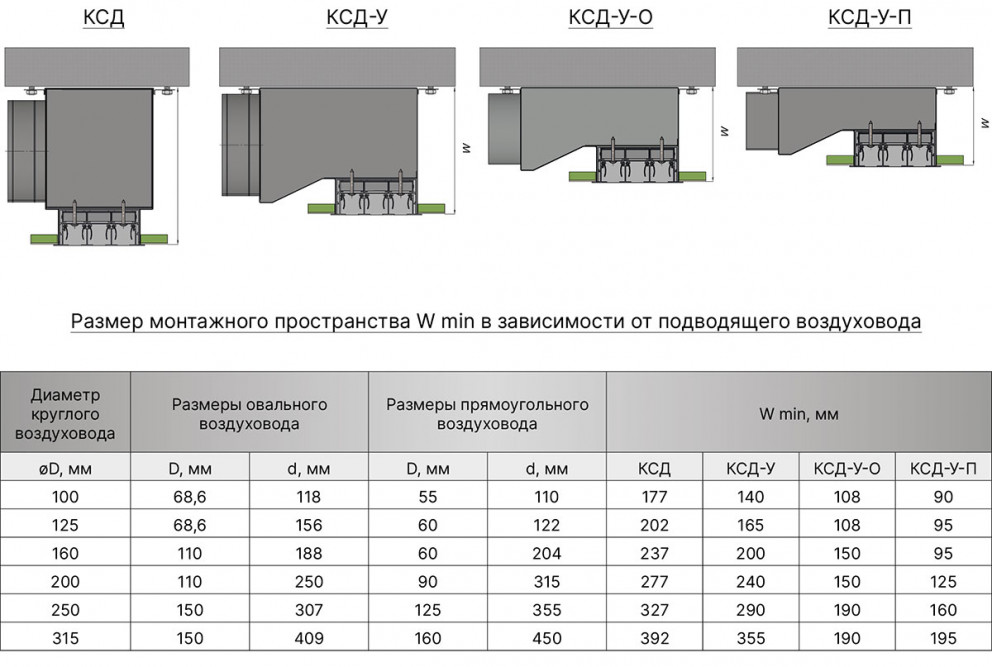 Размер монтажного пространства (W) напрямую зависит от размера подключаемого воздуховода - чем меньше воздуховод, тем меньше адаптер для диффузора. В каталоге приведены рекомендуемые размеры воздуховода, но по запросу заказчика возможно изготовить адаптер с любой врезкой.