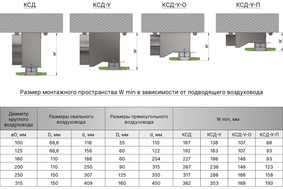 Размер монтажного пространства (W) напрямую зависит от размера подключаемого воздуховода - чем меньше воздуховод, тем меньше адаптер для диффузора. В каталоге приведены рекомендуемые размеры воздуховода, но по запросу заказчика возможно изготовить адаптер с любой врезкой.