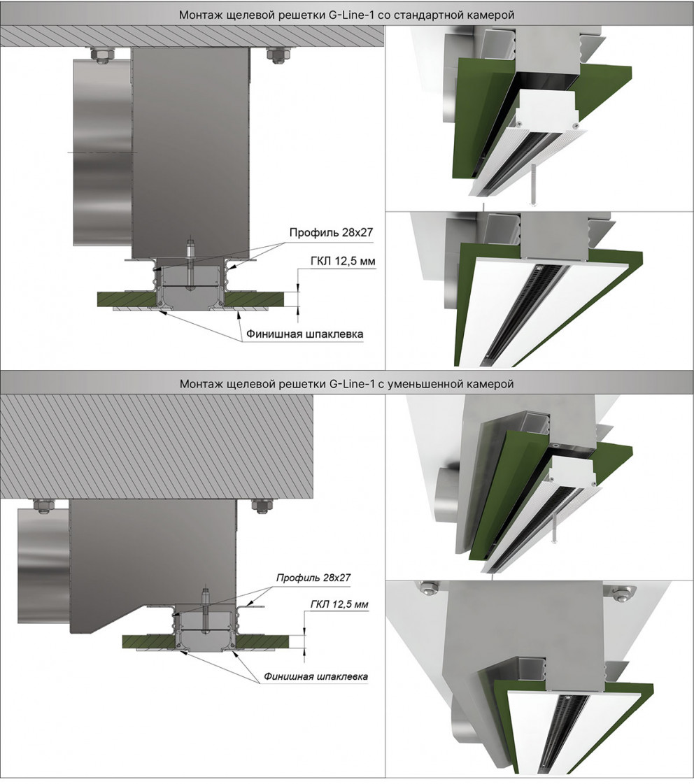К воздуховоду щелевые решетки монтируются посредством камеры статического давления (КСД). После установки КСД производится облицовка гипсокартоном, а затем монтируется решетка к закладным деталям в камере через перфорацию. Стыки между листами и поверхность потолка шпаклюются (под шпаклевку в рамке диффузора предусмотрена полка 2 мм). Выполняется покраска. Для лучшей адгезии финишного материала рамка имеет ребристую поверхность.