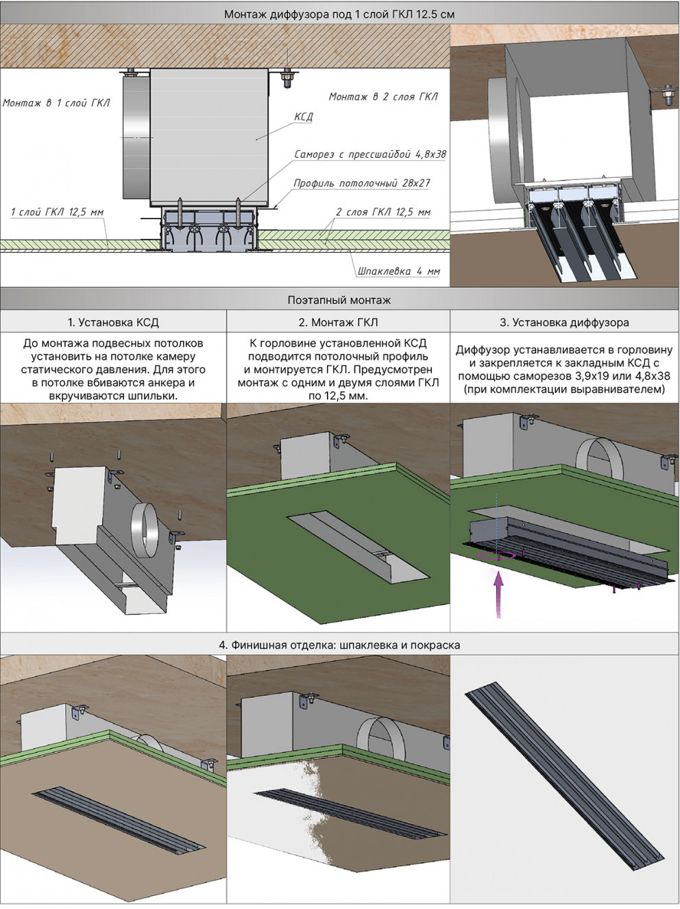 Для подключения диффузора к системе воздуховодов используется камера статического давления - КСД или КСР.