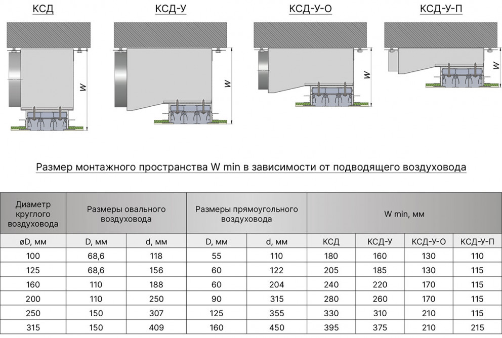 Размер монтажного пространства (W) напрямую зависит от размера подключаемого воздуховода - чем меньше воздуховод, тем меньше адаптер для диффузора. В каталоге приведены рекомендуемые размеры воздуховода, но по запросу заказчика возможно изготовить адаптер с любой врезкой.