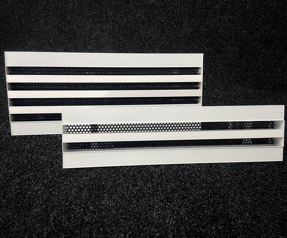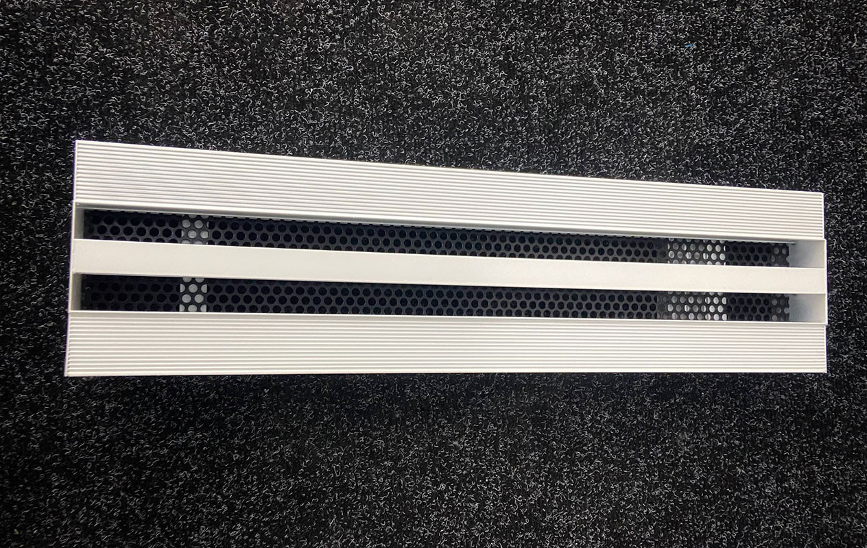 Конструкция профиля решетки предусматривает фланец с углублениями и отверстиями для лучшей адгезии финишного материала по длине решетки и заглушки с торца. После монтажа решетки, видимой частью в помещении остаются только щели.