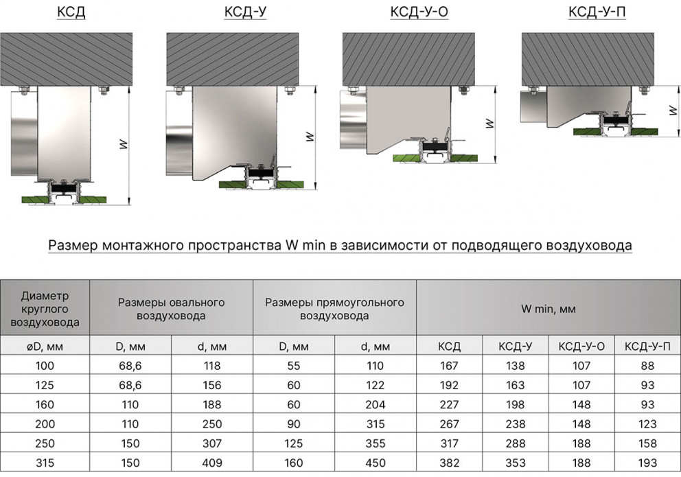 Размер монтажного пространства (W) напрямую зависит от размера подключаемого воздуховода - чем меньше воздуховод, тем меньше адаптер для диффузора. В каталоге приведены рекомендуемые размеры воздуховода, но по запросу заказчика возможно изготовить адаптер с любой врезкой.