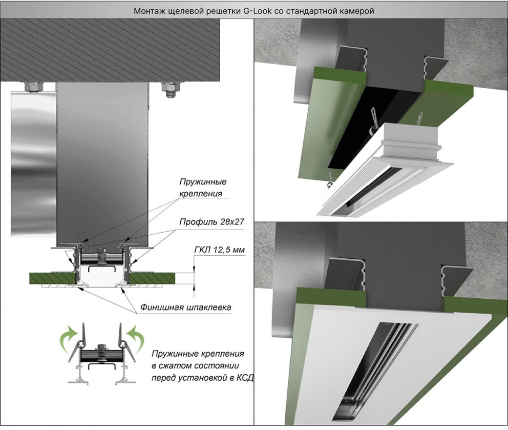К воздуховоду щелевые решетки монтируются посредством камеры статического давления (КСД). После установки КСД производится обрешетка потолочным профилем с последующей облицовкой гипсокартоном. Затем устанавливается решетка с помощью пружинных креплений. Стыки между листами и поверхность потолка шпаклюются (под шпаклевку в рамке диффузора предусмотрена полка 2,3 мм). Для лучшей адгезии финишного материала рамка имеет ребристую поверхность. Заключительный этап – покраска. После отделки видимой частью остается только щель, образующая лаконичную линию.