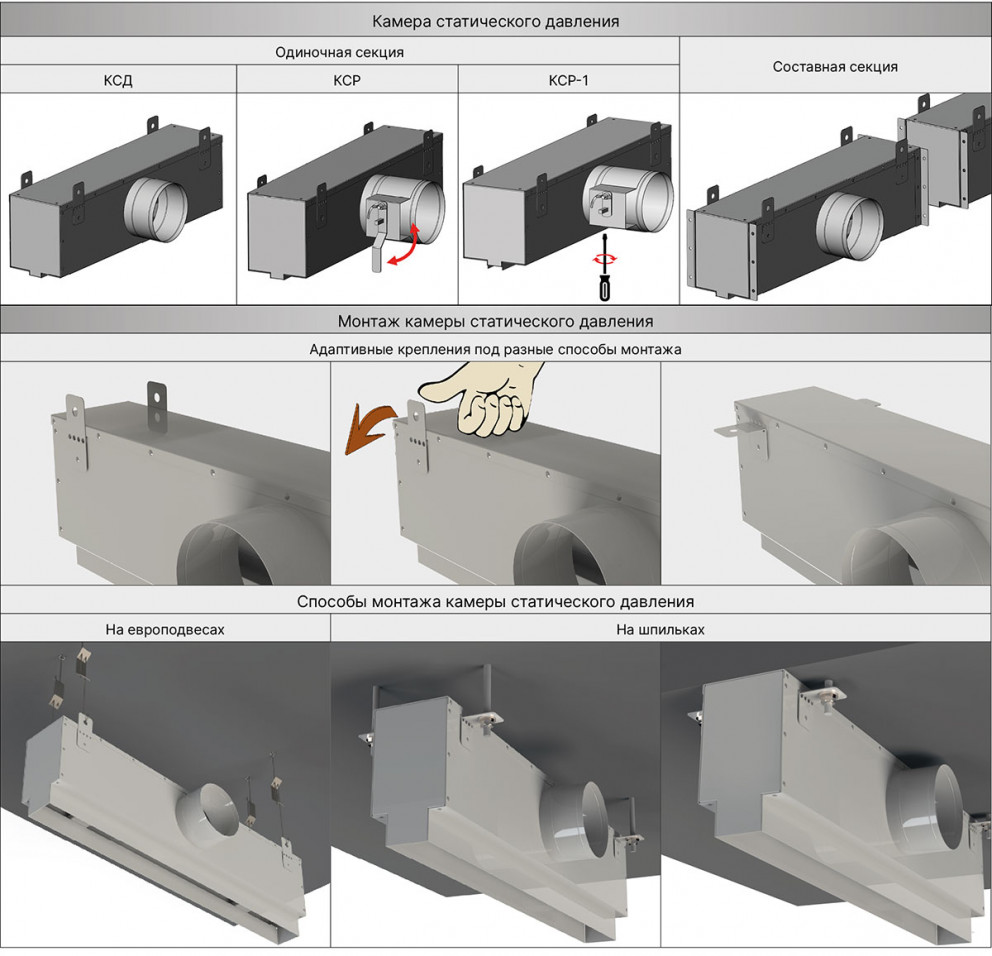 Для подключения к системе вентиляции и кондиционирования используется камера статического давления (адаптер) - КСД или КСР.