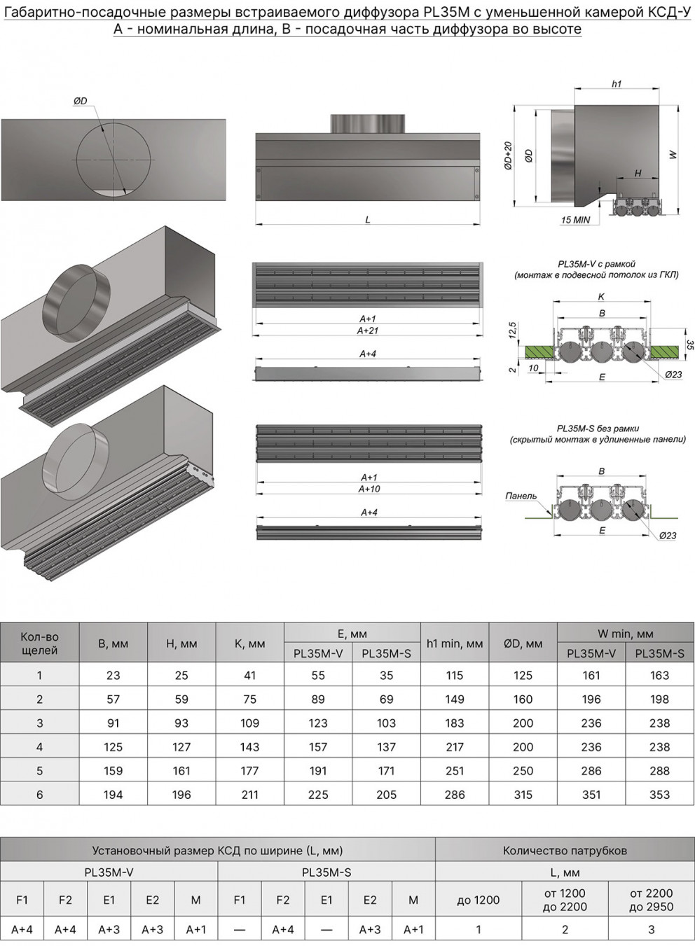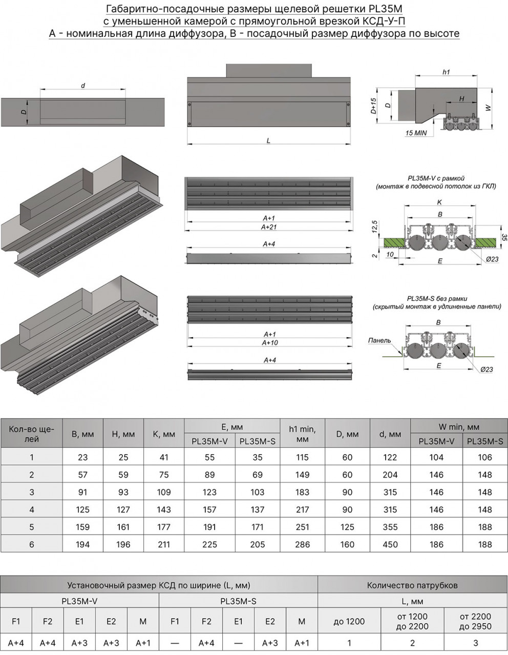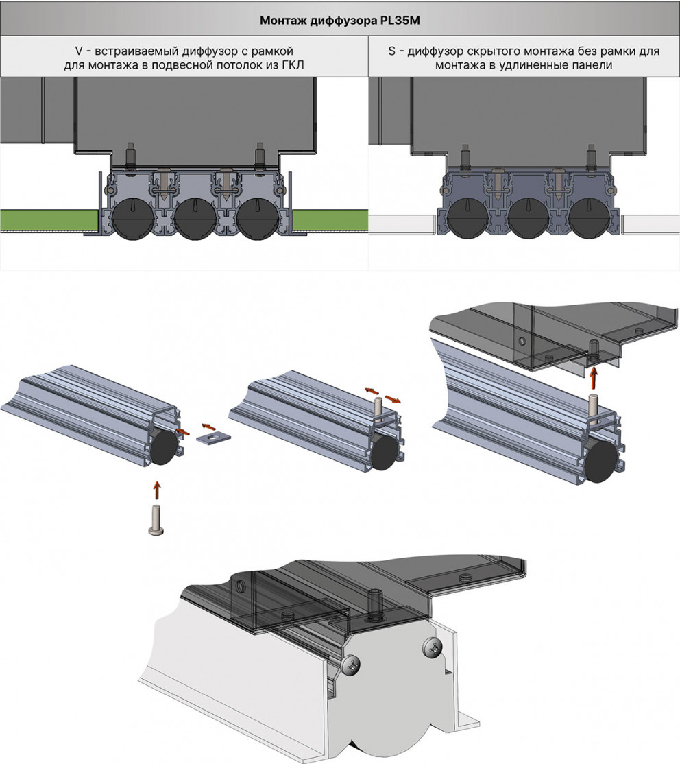 Рекомендованная высота для установки диффузора PL35M не более 4 м. Монтаж производится с помощью винтового соединения к закладным деталям в КСД через специальные изделия для крепления. В случае монтажа непрерывной конструкции, необходимо устанавливать в места соединения выравнивающие пластины. Изделия для крепления диффузоров входят в комплект поставки. После монтажа диффузора PL35M-V видимой частью остается рамка и щель, для PL35M-S только щель.