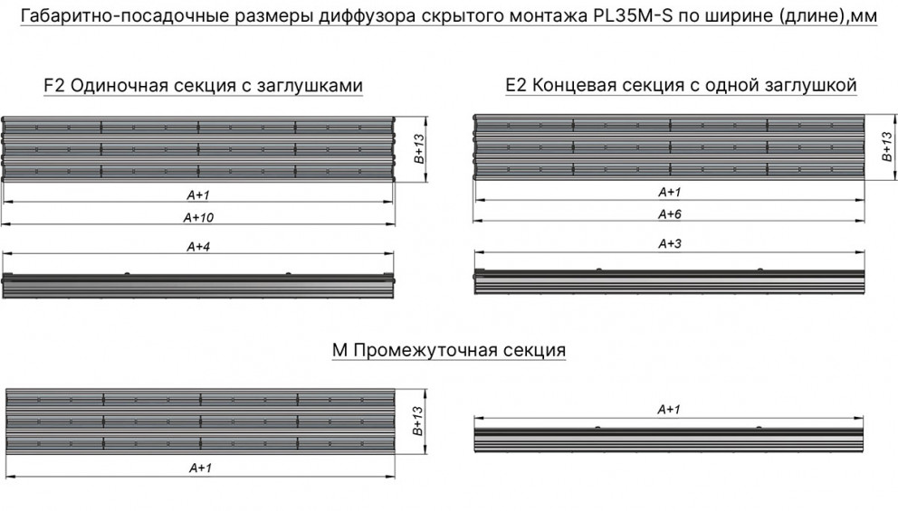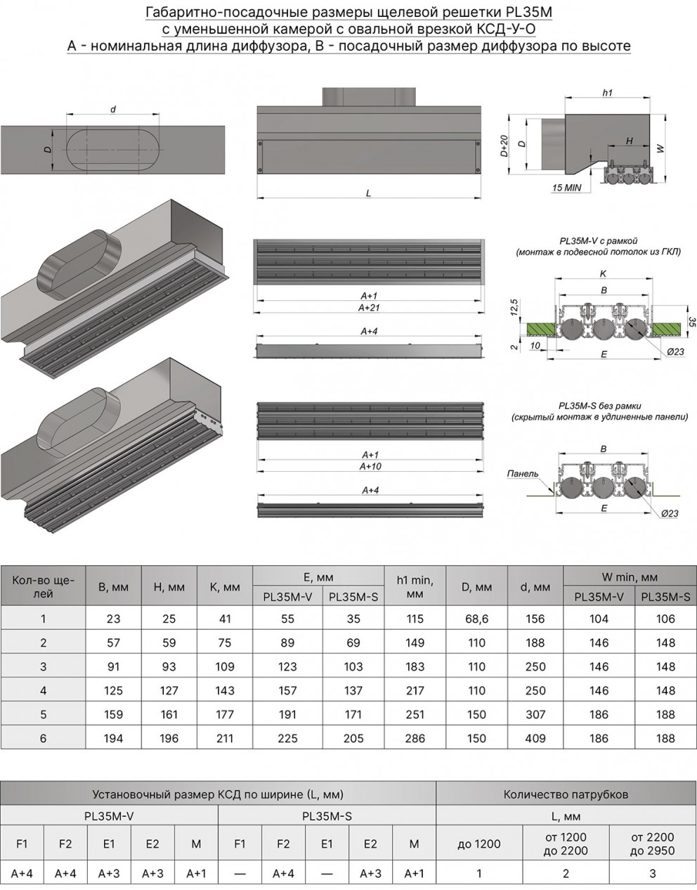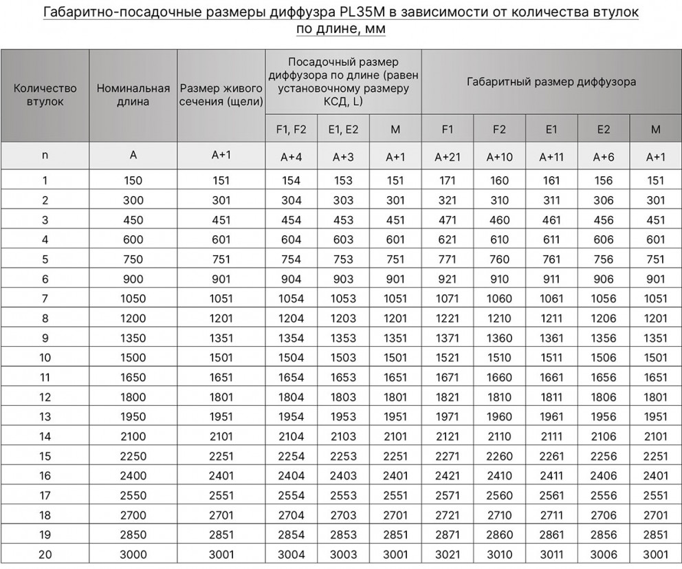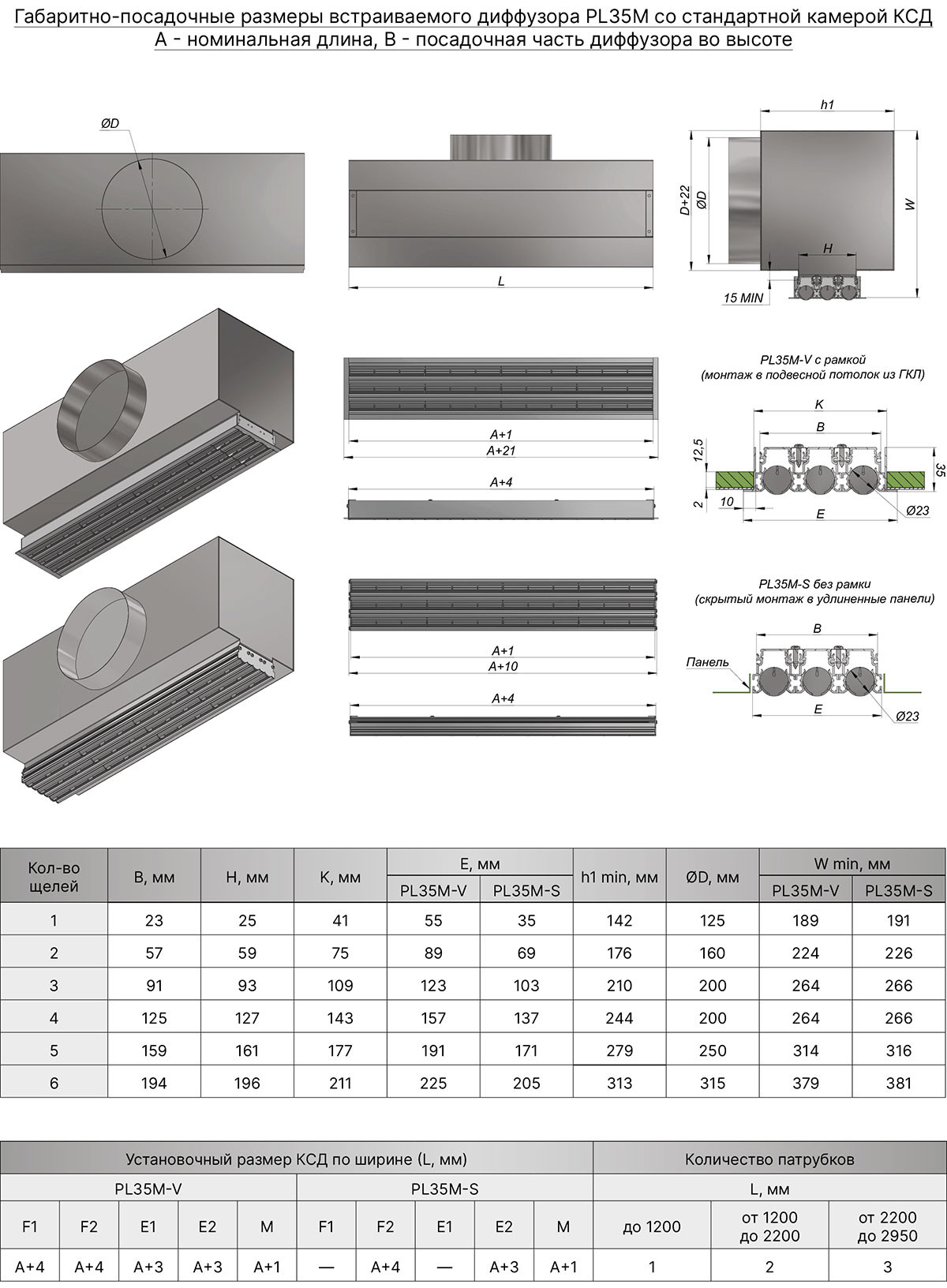 Рекомендованная высота для установки диффузора PL35M не более 4 м. Монтаж производится с помощью винтового соединения к закладным деталям в КСД через специальные изделия для крепления. В случае монтажа непрерывной конструкции, необходимо устанавливать в места соединения выравнивающие пластины. Изделия для крепления диффузоров входят в комплект поставки. После монтажа диффузора PL35M-V видимой частью остается рамка и щель, для PL35M-S только щель.