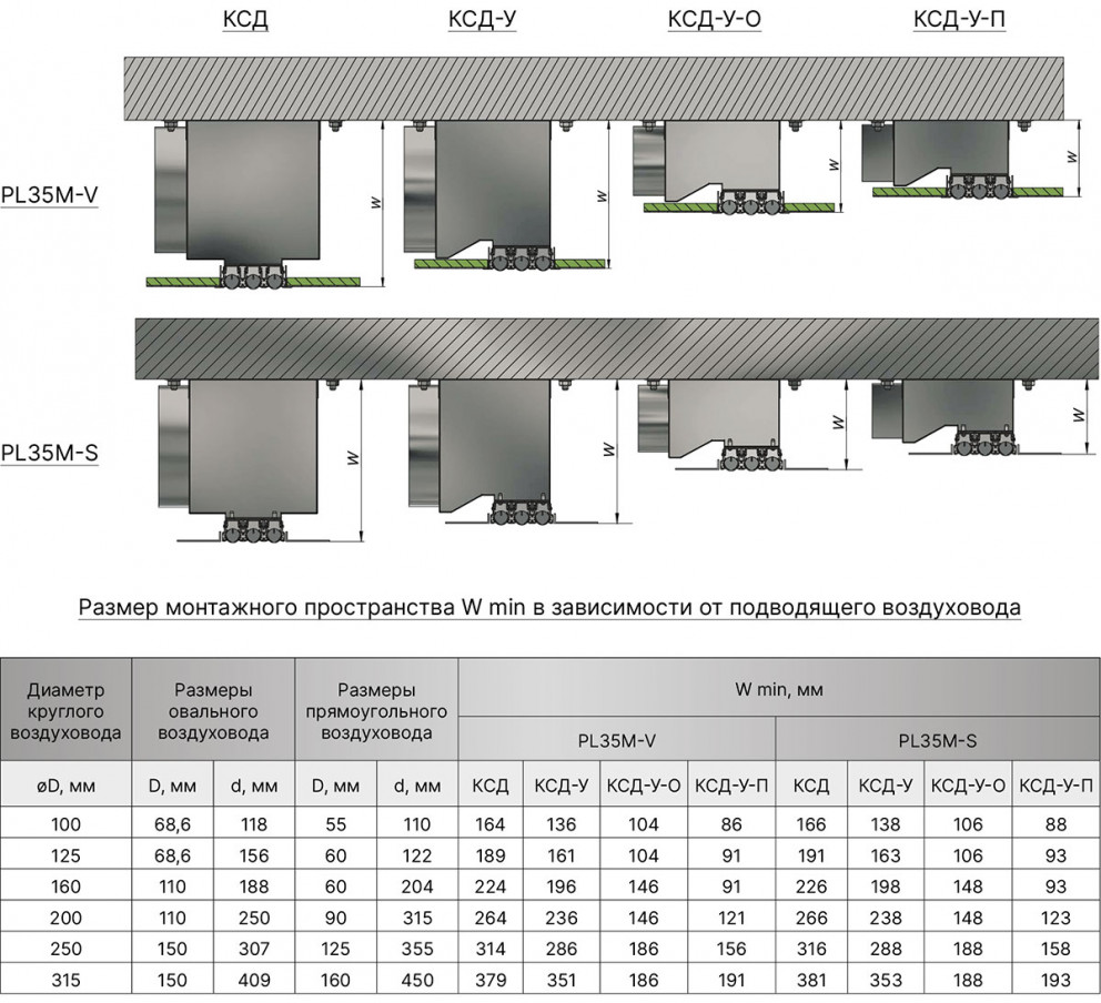 Размер монтажного пространства (W) напрямую зависит от размера подключаемого воздуховода - чем меньше воздуховод, тем меньше адаптер для диффузора. В каталоге приведены рекомендуемые размеры воздуховода, но по запросу заказчика возможно изготовить адаптер с любой врезкой.