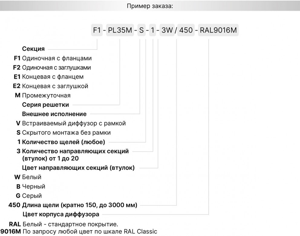 Корпус диффузоров PL35M изготавливаются из экструдированного алюминиевого профиля АД31 по ГОСТ 22233-2001, а устройства регулирования направления приточных струй – из АВС пластика. По умолчанию корпус диффузоров окрашивается в стандартный белый цвет RAL 9016М (матовый), по индивидуальному заказу возможна окраска в любой цвет по шкале RAL. Возможные цвета направляющих из пластика: белый (близкий к RAL 9016), серый (близкий к RAL 7047) и черный (близкий к RAL 9005).