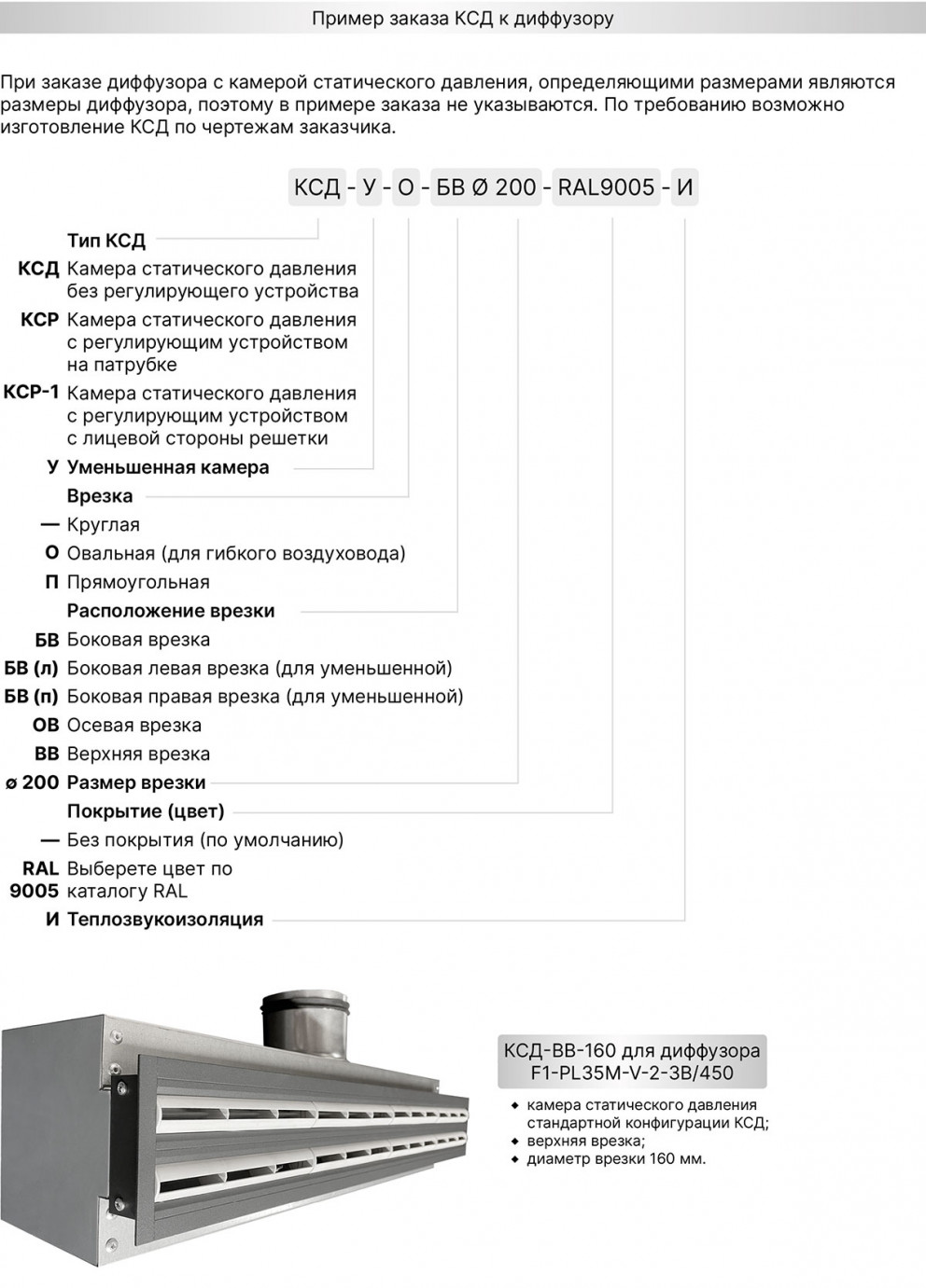 Для подключения к системе вентиляции и кондиционирования используется камера статического давления (адаптер) - КСД или КСР.