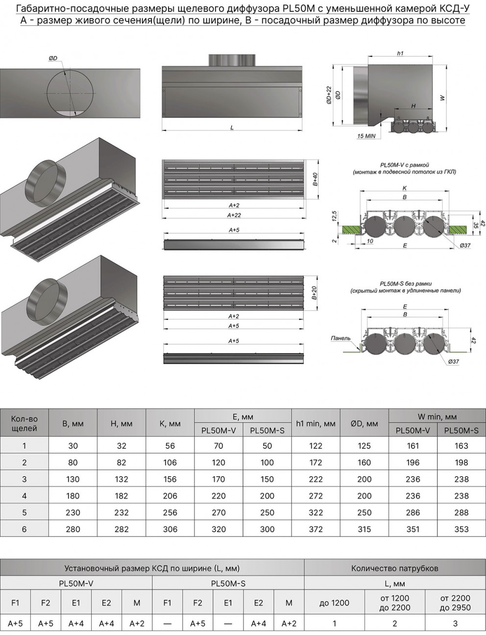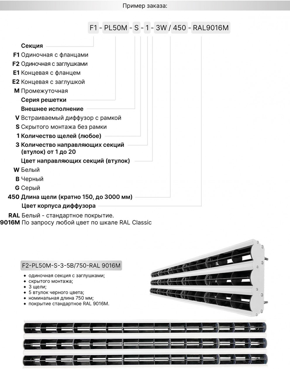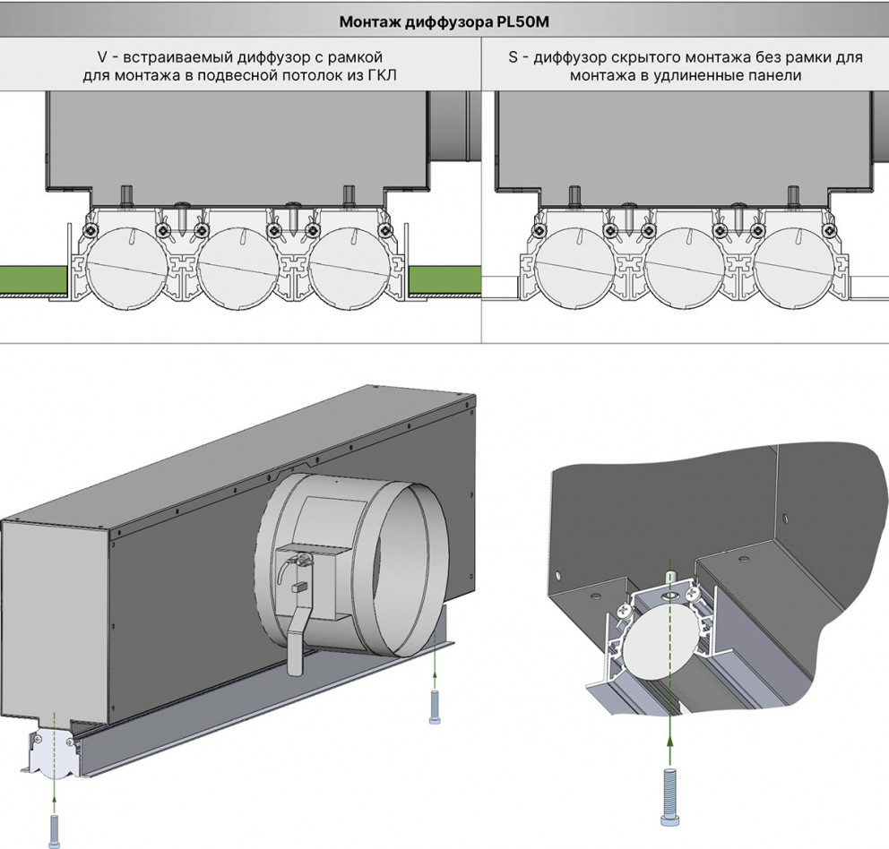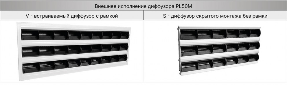Монтаж. Рекомендованная высота для установки диффузора PL50M не более 4 м. Монтаж производится с помощью винтового соединения к закладным деталям в КСД через специальные изделия для крепления. В случае монтажа непрерывной конструкции, необходимо устанавливать в места соединения выравнивающие пластины. Изделия для крепления диффузоров входят в комплект поставки. После монтажа диффузора PL50M-V видимой частью остается рамка и щели, для PL50M-S только щели.