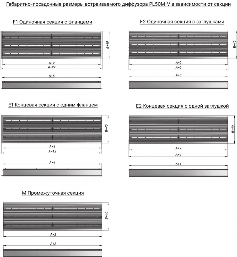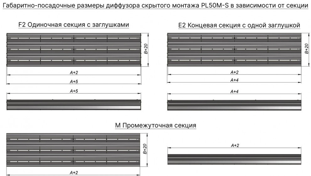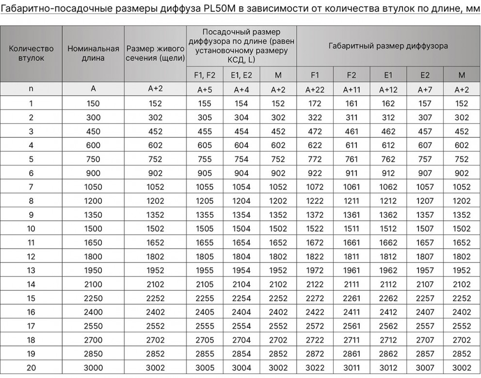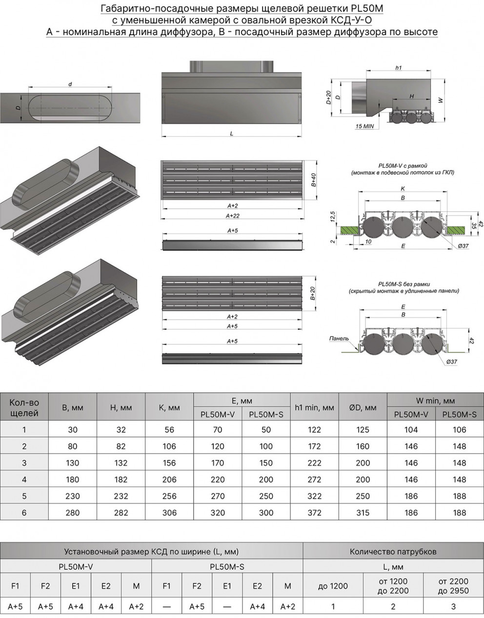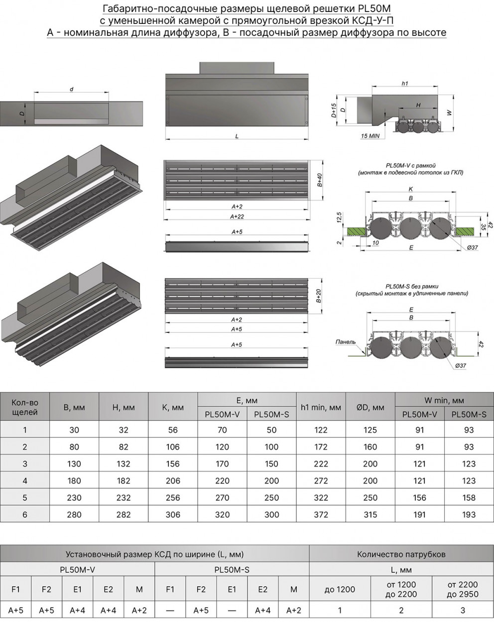 Монтаж. Рекомендованная высота для установки диффузора PL50M не более 4 м. Монтаж производится с помощью винтового соединения к закладным деталям в КСД через специальные изделия для крепления. В случае монтажа непрерывной конструкции, необходимо устанавливать в места соединения выравнивающие пластины. Изделия для крепления диффузоров входят в комплект поставки. После монтажа диффузора PL50M-V видимой частью остается рамка и щели, для PL50M-S только щели.