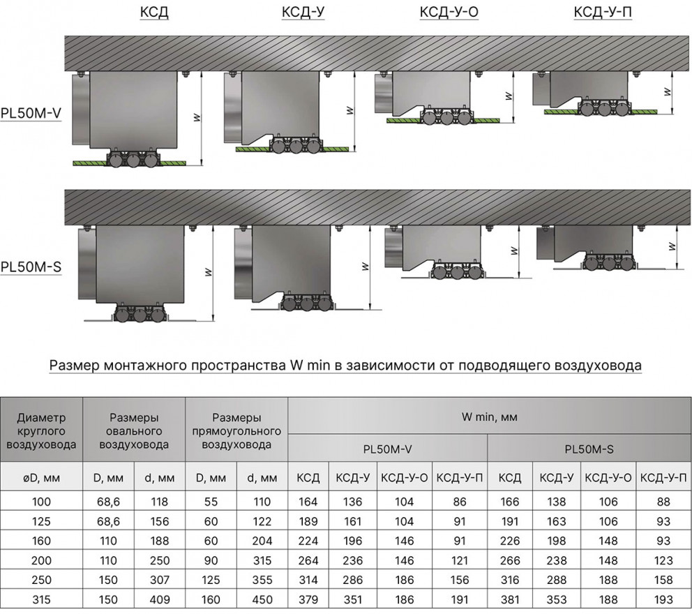 Размер монтажного пространства (W) напрямую зависит от размера подключаемого воздуховода - чем меньше воздуховод, тем меньше адаптер для диффузора. В каталоге приведены рекомендуемые размеры воздуховода, но по запросу заказчика возможно изготовить адаптер с любой врезкой.