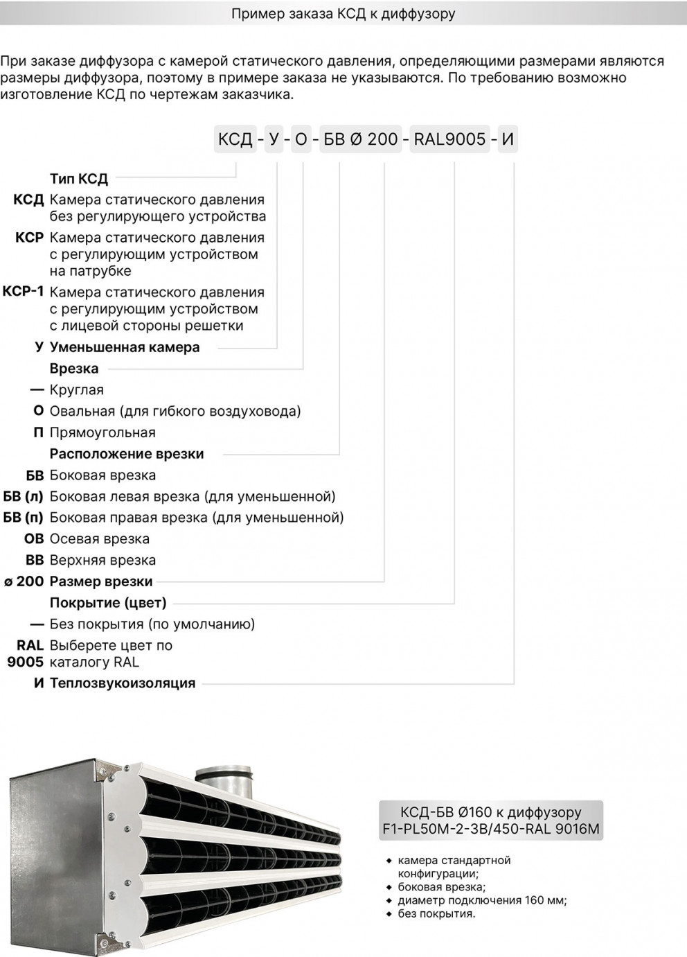 Для подключения диффузора к системе воздуховодов используется камера статического давления - КСД или КСР.