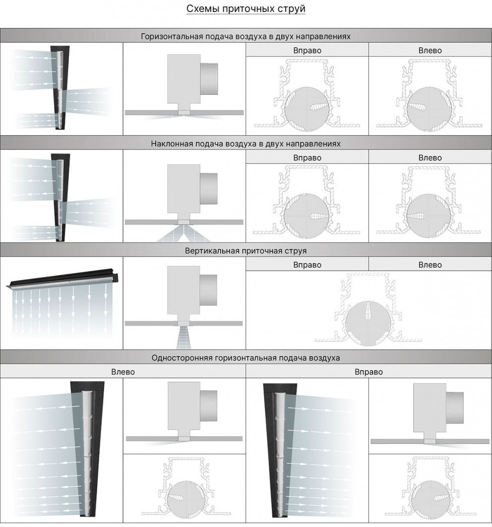 - Возможность регулирования направления воздушного потока горизонтально, вертикально и наклонно. Направление приточной струи настраивается вручную в одном или одновременно в нескольких направлениях, что позволяет адаптировать приток воздуха к конкретным условиям.